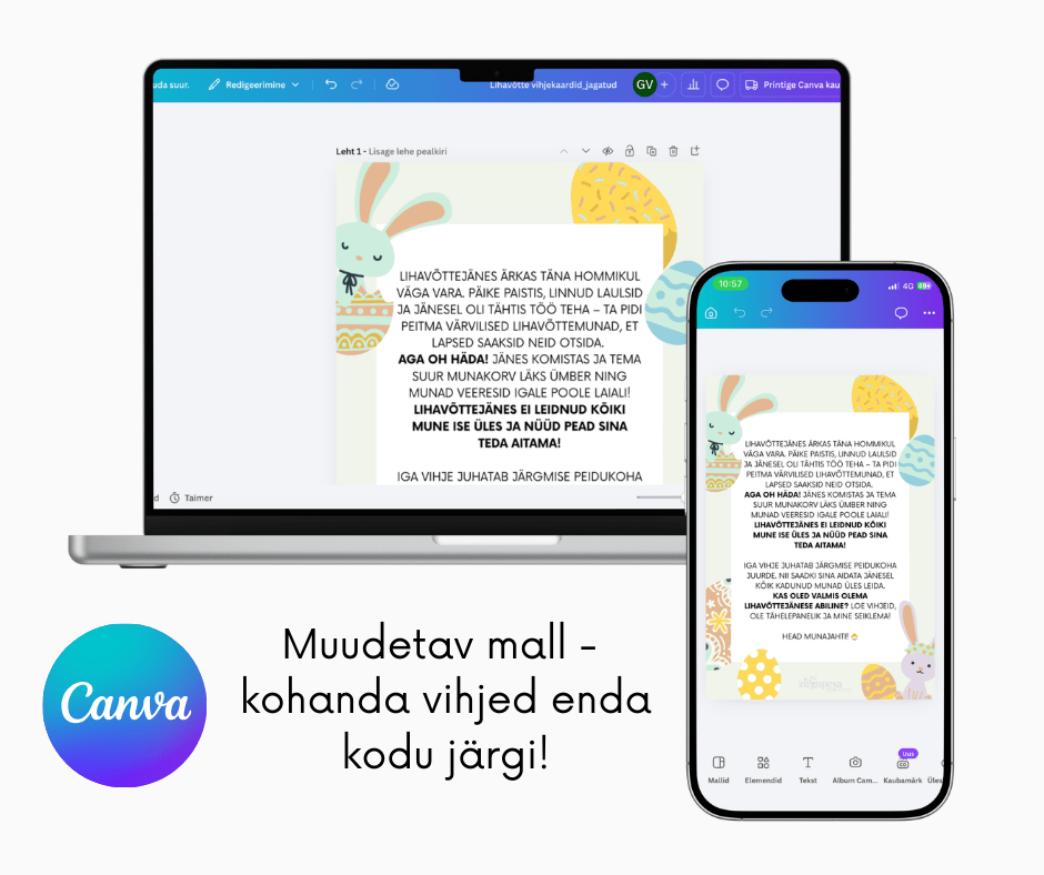Tee lihavõttepühad laste jaoks eriti põnevaks! See Canva mall sisaldab valmis munajahi legendi ja vihjekaarte, mis loovad lõbusa seikluse 3–7-aastastele lastele. Lihtsalt ava mall Canvas, kohanda vihjed enda kodule sobivaks.